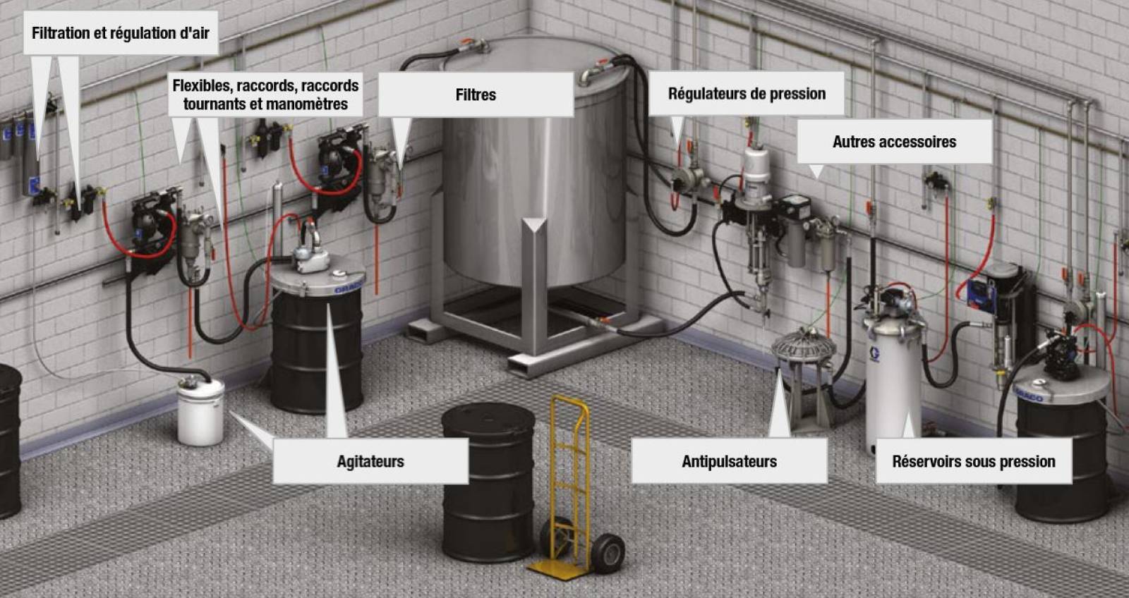 Des kits régulateurs, filtres, antipulsateurs, réchauffeurs produits, flexibles haute ou basse pression et raccords haute performance viennent compléter votre installation pour une maîtrise parfaite de vos process.