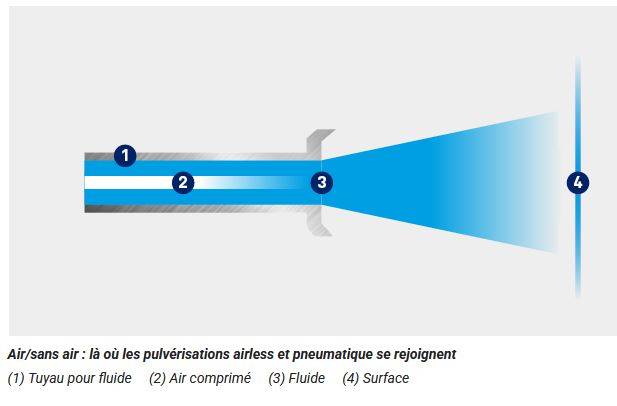 La pulvérisation airmixte ou aircoat mélange ces deux techniques de pulvérisation en alliant la haute pression et l'adjonction d'air pour une finition plus fine.