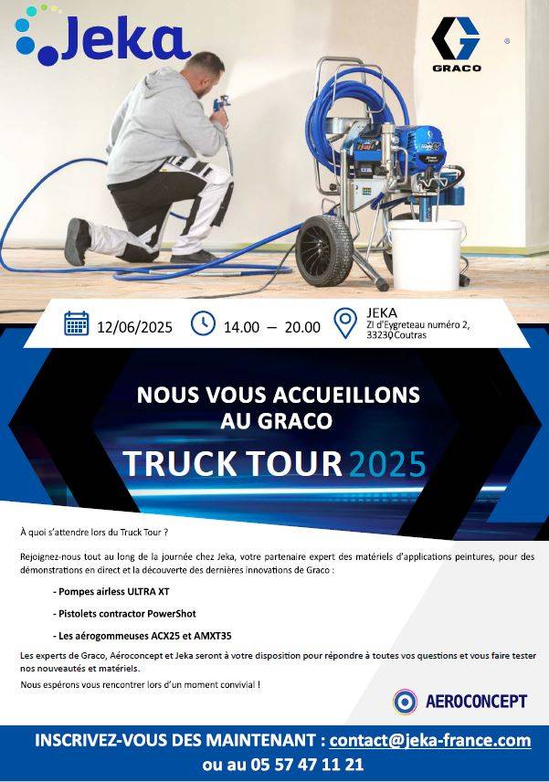 A cette occasion JEKA et AEROCONCEPT s'associent pour vous recevoir pour vous présenter les nouveautés de la gamme bâtiment GRACO et vous faire profiter de démonstrations en direct :